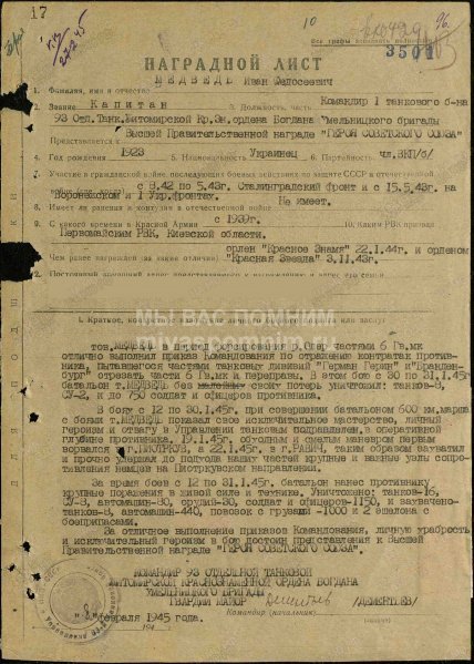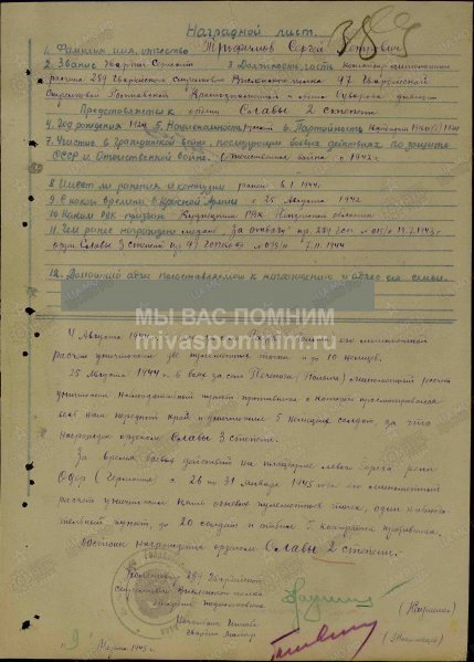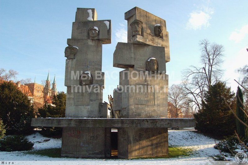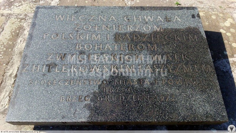 "Памятник Советско-Польскому братству по оружию (Опольское воеводство, Бжег) Польский город Бжег (польск. Brzeg [b??k] — «берег», нем. Brieg) — входит в Опольское воеводство, и располагается на берегу реки Одер. Его название связано с расположением на Одре (brzeg – пол. «берег»), в прошлом он также назывался Высоки Бжег. Город является одним из самых старых в Польше, он был организован в первой половине XIII века на месте существовавшего здесь ещё до 1200 года рыбачьего поселения. Большую часть своего существования город был обнесен крепостной стеной, а в девятнадцатом веке в Бжеге расположился крупный железнодорожный узел, связывающий Вроцлав и Опполе. Именно поэтому в 1945 году отступая, немецкие войска предприняли попытку закрепиться в Бжеге, и парализовать работу железной дороги. «В ходе Висло-Одерской операции войска 1-го Украинского фронта на широком фронте вышли к реке Одер и, форсировав реку, захватили несколько плацдармом. На этом операция была приостановлена, так как для продолжения наступления на берлинском направлении необходимо было дождаться успехов правого фланга стратегического фронта в Восточной Пруссии и Померании. При этом на отдельных направлениях бои продолжались. Так в начале февраля войска 3-й гвардейской армии Гордова и соединения 4-й танковой армии Лелюшенко ликвидировали окруженную вражескую группировку южнее Рютцена. В этих боях 13 тыс. солдат и офицеров противника были ликвидированы, около 3 тыс. человек взяли в плен. Тяжелые бои шли и в районе города Бриг, который стоял на правом берегу Одера и был превращен в мощный опорный пункт. 5-я гвардейская армия Жадова и 21-я армия Гусева захватили южнее и севернее города плацдармы и стремились соединить их. Сначала они соединили плацдармы, и окружили город, а затем взяли его, создав один большой плацдарм, на правом берегу Одера. Бои в районе Брига завершились только перед самым началом новой операции. Кроме того, шли бои локального характера, советские войска расширяли плацдармы, ликвидировали остатки разрозненных и окруженных в тылу немецких частей и т. д.». Рокоссовский К. К. Солдатский долг. М., 1988 Бжег был освобожден 6 февраля 1945 года войсками 1Украинского фронта - соединениями пятой гвардейской и двадцать первой армий. Войскам, участвовавшим в боях при форсировании р. Одер и овладении плацдармом юго-восточнее Бреслау, в ходе которых были освобождены Бриг и другие города, приказом ВГК от 6 февраля 1945 г. объявлена благодарность и в Москве дан салют 20 артиллерийскими залпами из 224 орудий. Наградили также героически сражавшихся за Бриг бойцов Красной армии. Так Приказом по 5-й гвардейской армии от 12 апреля 1945 года гвардии сержант Трофимов награждён орденом Славы 2-й степени. Трофимову Сергею Петровичу, командиру миномётного расчёта 289-го гвардейского стрелкового полка, зимой 1945 года было 20 лет. За четыре дня боевых действий на плацдарме левого берега реки Одер севернее города Бриг миномётный расчёт гвардии сержанта Трофимова отбил 5 контратак противника, уничтожил пять огневых пулемётных точек, один наблюдательный пункт, до 20 солдат противника. Сергей Петрович встретил Победу в Берлине, став полным кавалером ордена Славы. Званием Героя Советского Союза посмертно был награжден Медведь Иван Федосеевич, ему на момент сражений в Польше было всего 22 года. Его боевой путь – 600 кило